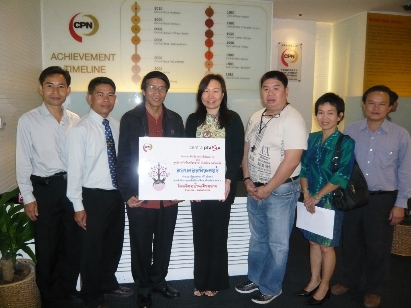 ท่านรองอัศรายุทธ ศรีใจอินทร์ นำคณะซึ่งประกอบ ผอ.อรทัย ยศเมธา ผอ.สมชาย สันกลกิจ อาจารย์สมบัติ สาคร พบตัวแทนจากบริษัทเซ็นทรัลพัฒนาจำกัดมหาชน คุณอรชร จันทร์วิวัฒนา และคุณธีรเดช กมลสันติโรจน์ เพื่อรับมอบคอมพิวเตอร์เพื่อการศึกษาจำนวน 20 เครื่อง เมื่อวันที่ 1 เม.ย. 2554 ณ เซ็นทรัลแอ์พอร์ทพลาซ่า