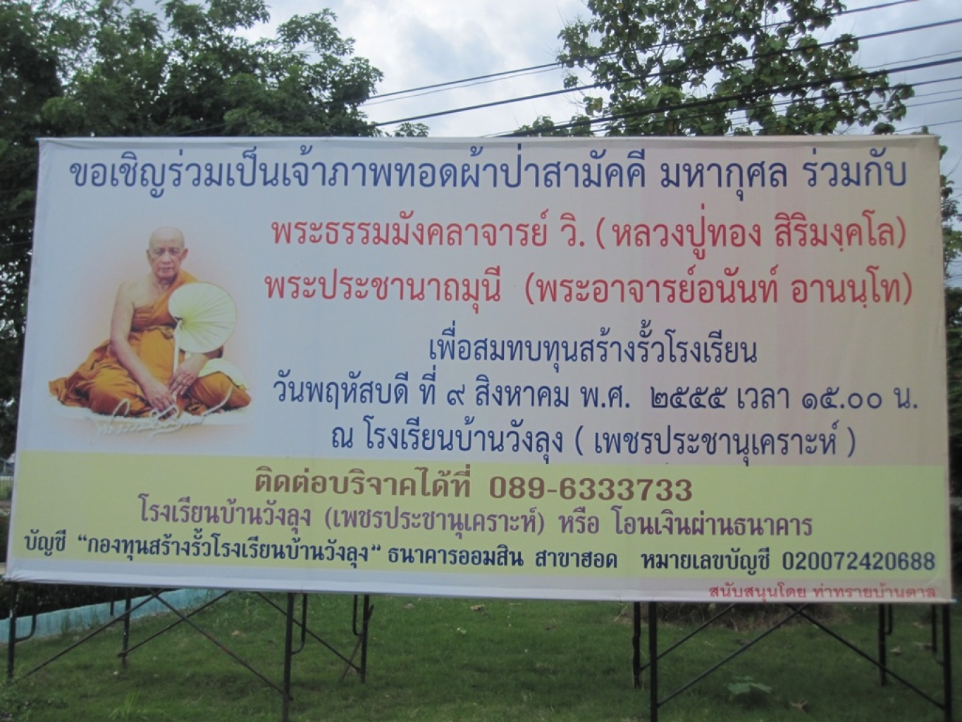 เรียนเชิญผู้อำนวยการ รองผู้อำนวยการสำนักงานเขตพื้นที่การศึกษาเชียงใหม่เขต ๕ ผูู้อำนวยการ รองผู้อำนวยการ คณะครู บุคลากรทางการศึกษาอำเภอฮอดทุกโรง ร่วมเป็นเกียรติและร่วมทำบุญทอดผ้าป่ามหากุศลเพื่อระดมทูนสร้างรั้วโรงเรียนบ้านวังลุงในวันที่ ๙ สิงหาคม ๒๕๕๕ ณ โรงเรียนบ้านวังลุง ตั้งแต่เวลา ๑๕.๐๐ น. เป็นต้นไป